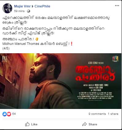 കുഞ്ചാക്കോ ബോബനെ നായകനാക്കി മിഥുന് മാനുവല് തോമസ് സംവിധാനം ചെയ്ത ഇന്വെസ്റ്റിഗേറ്റീവ് ത്രില്ലര് അഞ്ചാം പാതിരക്ക് തിയേറ്ററുകളില് മികച്ച പ്രതികരണം. മലയാള സിനിമയില് നല്ല ത്രില്ലര് ചിത്രങ്ങള് ഉണ്ടാവുന്നില്ലെന്ന പരാതി ഈ ചിത്രം ഡബിള് വോള്ട്ടേജില് തന്നെ തീര്ത്തിട്ടുണ്ടെന്നാണ് കണ്ടിറങ്ങിയ പ്രേക്ഷകര് പറയുന്നത്. അജ്ഞാതനായ ഒരു സീരിയല് കില്ലറെ പിന്തുടരുന്ന ക്രിമിനോളജിസ്റ്റായാണ് സിനിമയില് കുഞ്ചാക്കോ ബോബനെത്തുന്നത്.