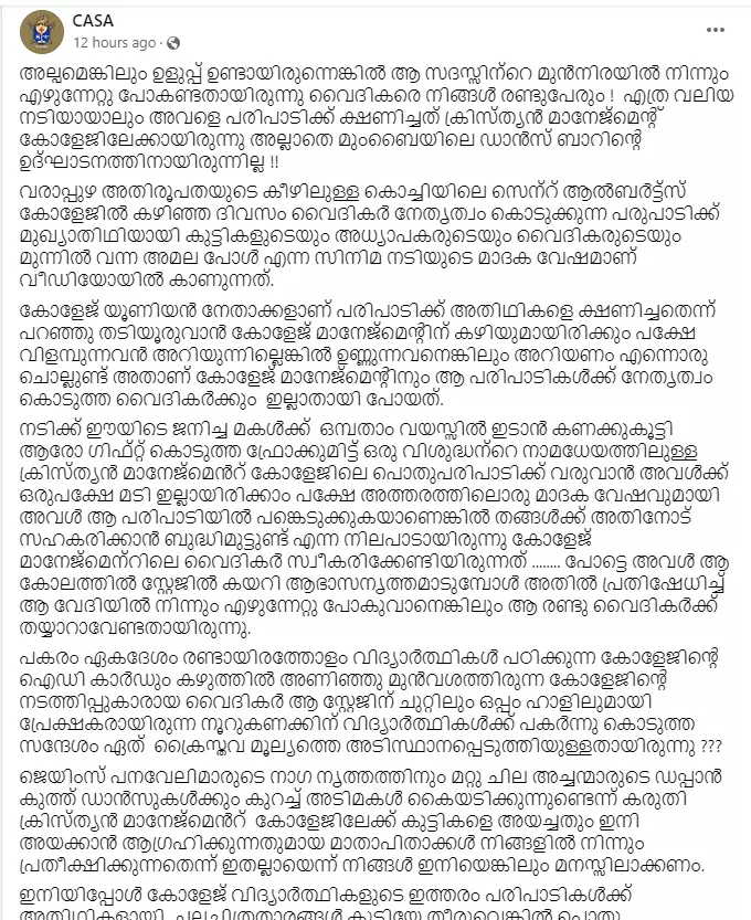 അല്പമെങ്കിലും ഉളുപ്പ് ഉണ്ടായിരുന്നെങ്കില് ആ സദസിന്റെ മുന്നിരയില് നിന്നും എഴുന്നേറ്റു പോകണ്ടതായിരുന്നു വൈദികരെ നിങ്ങള് രണ്ടുപേരും! എത്ര വലിയ നടിയായാലും അവളെ പരിപാടിക്ക് ക്ഷണിച്ചത് ക്രിസ്ത്യന് മാനേജ്മെന്റ് കോളേജിലേക്കായിരുന്നു അല്ലാതെ മുംബൈയിലെ ഡാന്സ് ബാറിന്റെ ഉദ്ഘാടനത്തിനായിരുന്നില്ല.