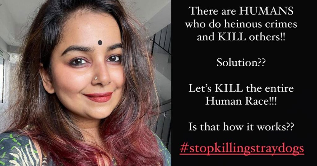 തെരുവ് നായ്ക്കളെ കൊല്ലുന്നത് നിര്ത്തൂ എന്ന ഹാഷ്ടാഗ് പങ്കുവച്ചാണ് മൃദുലയുടെ പോസ്റ്റ്. ”പൈശാചികമായ കുറ്റകൃത്യങ്ങള് ചെയ്യുന്ന മറ്റുള്ളവരെ കൊന്നൊടുക്കുന്ന മനുഷ്യരുണ്ട്. എന്താണ് ഇതിന് പരിഹാരം. മുഴുവന് മനുഷ്യവര്ഗത്തെയും കൊന്നൊടുക്കുക! ഇങ്ങനെയാണോ കാര്യങ്ങള് നടത്തേണ്ടത്” എന്നാണ് മൃദുല സോഷ്യല് മീഡിയയില് കുറിച്ചിരിക്കുന്നത്.