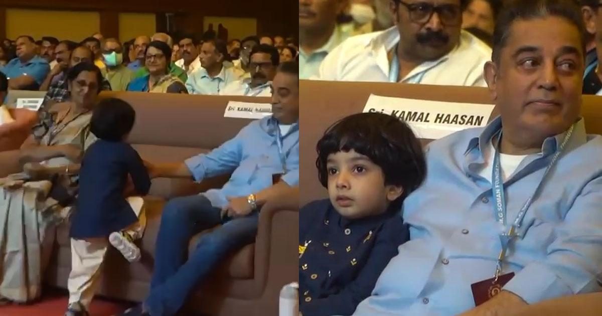 ചടങ്ങുകള് പുരോഗമിക്കുന്ന കാണുകയായിരുന്ന കമല്ഹാസന്റെ അടുത്തേക്ക് മല്ഹാര് വരുന്നതും, താരത്തിന്റെ തൊട്ടടുത്തായി കയറിയിരിക്കുന്നതും, കമല് കുട്ടിയെ ചേര്ത്തു പിടിക്കുന്നതുമാണ് വീഡിയോയിലുള്ളത്.