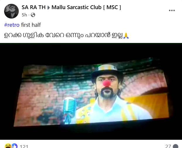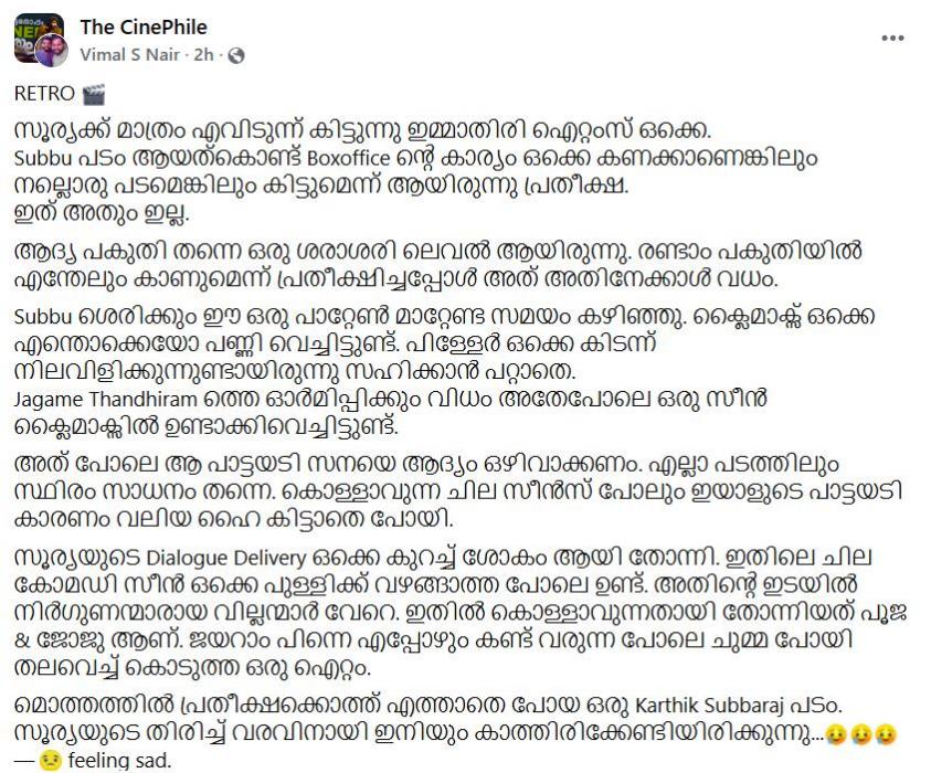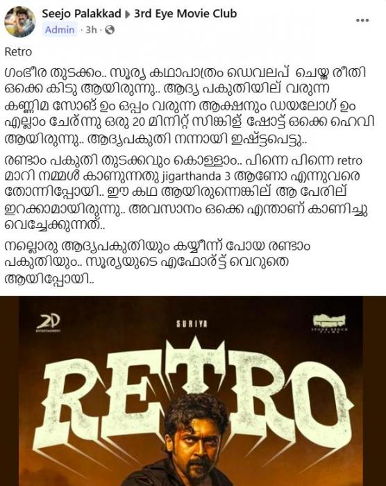 ”ഗംഭീര തുടക്കം.. സൂര്യ കഥാപാത്രം ഡെവലപ് ചെയ്ത രീതി ഒക്കെ കിടു ആയിരുന്നു.. ആദ്യ പകുതിയില് വരുന്ന കനിമ സോങ് ഉം ഒപ്പം വരുന്ന ആക്ഷനും ഡയലോഗ് ഉം എല്ലാം ചേര്ന്നു ഒരു 20 മിനിറ്റ് സിങ്കിള് ഷോട്ട് ഒക്കെ ഹെവി ആയിരുന്നു.. ആദ്യപകുതി നന്നായി ഇഷ്ടപെട്ടു.. രണ്ടാം പകുതി തുടക്കവും കൊള്ളാം.. പിന്നെ പിന്നെ റെട്രോ മാറി നമ്മള് കാണുന്നതു ജിഗര്തണ്ട 3 ആണോ എന്നുവരെ തോന്നിപ്പോയി.. ഈ കഥ ആയിരുന്നെങ്കില് ആ പേരില് ഇറക്കാമായിരുന്നു.. അവസാനം ഒക്കെ എന്താണ് കാണിച്ചു വെച്ചേക്കുന്നത്.. നല്ലൊരു ആദ്യപകുതിയും കയ്യീന്ന് പോയ രണ്ടാം പകുതിയും.. സൂര്യയുടെ എഫോര്ട്ട് വെറുതെ ആയിപ്പോയി..” എന്നാണ് ഫറെയ്സ്ബുക്കില് എത്തിയ മറ്റൊരു പ്രതികരണം.