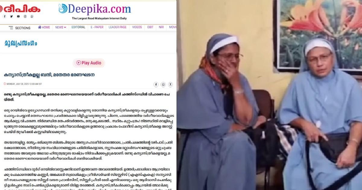 ചത്തീസ്ഗഢിൽ രണ്ട് മലയാളി കന്യാസ്ത്രീകൾ അറസ്റ്റിലായ വിഷയത്തിൽ ബിജെപിക്കെതിരേ അതിരൂക്ഷ വിമർശനവുമായി കത്തോലിക്ക സഭയുടെ മുഖപത്രമായ ദീപികയുടെ മുഖപ്രസംഗം. രണ്ട് കന്യാസ്ത്രീകളെയല്ല മതേതര ഭരണഘടനയെയാണ് വർഗീയവാദികൾ ബന്ദികളാക്കിയതെന്ന് മുഖപ്രസംഗം വിമർശിക്കുന്നു. മതരാജ്യങ്ങളിൽ മാത്രം നടക്കുന്ന കാര്യങ്ങളാണ് രാജ്യത്ത് അരങ്ങേറുന്നതെന്നും മുഖപ്രസംഗം ചൂണ്ടിക്കാട്ടുന്നു.