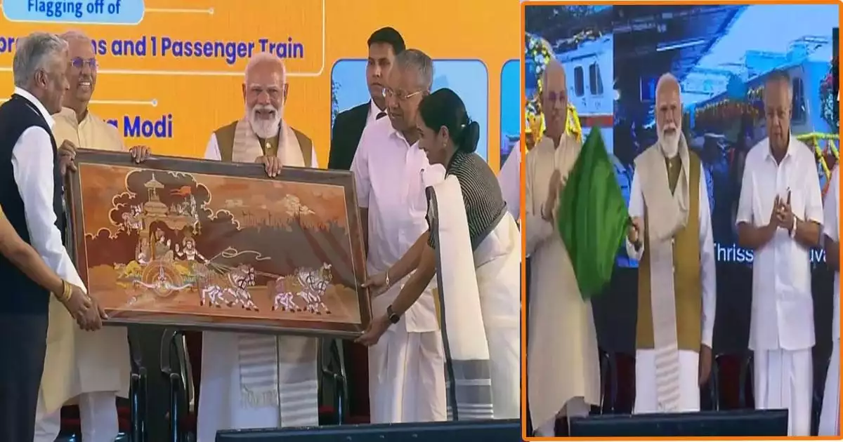 കേരളത്തിനെ സംബന്ധിച്ച് വികസനത്തിനു പുതിയ ദിശാബോധം വന്ന ദിവസമാണ് ഇന്നെന്ന് പ്രധാനമന്ത്രി നരേന്ദ്രമോദി. അമൃത് ഭാരത്, പാസഞ്ചര്‍ ട്രെയിനുകളുടെ ഫ്‌ളാഗ് ഓഫ് ചെയ്ത് സംസാരിക്കുകയായിരുന്നു പ്രധാനമന്ത്രി. വികസിത കേരളത്തിലൂടെ മാത്രമേ വികസിത ഭാരതം പൂര്‍ണമാകൂ എന്നും അതിനായി രാജ്യം ഒറ്റക്കെട്ടായി പ്രവര്‍ത്തിക്കുന്നുവെന്നും പ്രധാനമന്ത്രി നരേന്ദ്ര മോദി പറഞ്ഞു. കേരളത്തിന് ലഭിച്ച മൂന്ന് അമൃത് ഭാരത് അടക്കം നാലു ട്രെയിനുകള്‍ ഫ്ളാഗ് ഓഫ് കര്‍മം നിര്‍വ്വഹിച്ചു സംസാരിക്കവെ കേന്ദ്രസര്‍ക്കാര്‍ നടപ്പാക്കിയ വികസനപ്രവര്‍ത്തനങ്ങളെ കുറിച്ചും വാഗ്ദാനങ്ങളെ കുറിച്ചും മോദി വാചാലനായി
