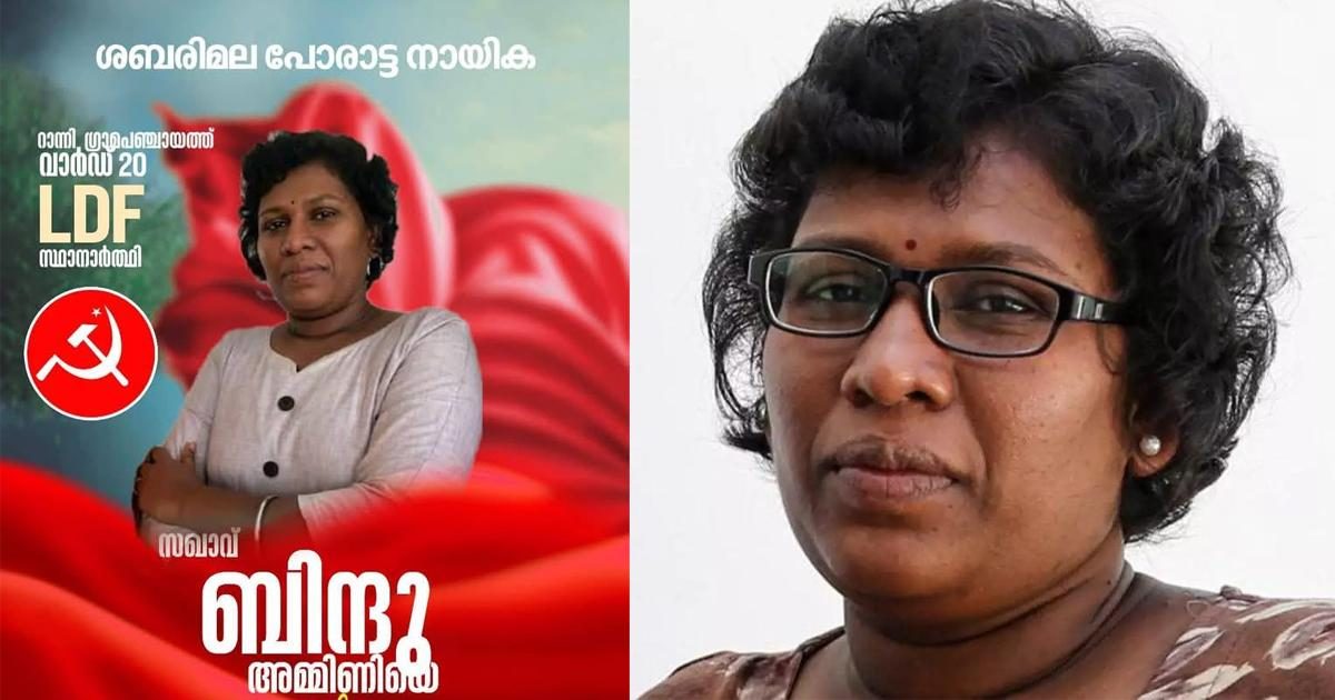 ‘ശബരിമല പോരാട്ട നായിക’ എന്ന തലക്കെട്ടോടെയാണ് കാര്‍ഡ് പ്രചരിക്കുന്നത്. അതേസമയം, താന്‍ മത്സരിക്കുന്നില്ലെന്നും വ്യാജ പ്രചാരണം നടക്കുന്നതായും വ്യക്തമാക്കി ബിന്ദു അമ്മിണിയും രംഗത്തെത്തിയിട്ടുണ്ട്. ഫേക്ക് പോസ്റ്ററും പ്രചരിപ്പിക്കുന്ന അക്കൗണ്ടും പങ്കുവച്ചാണ് ബിന്ദുവിന്റെ പോസ്റ്റ്.