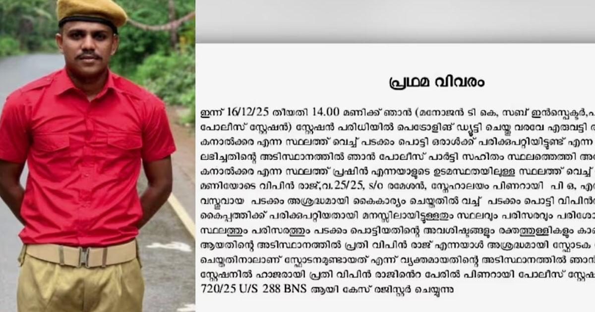 കണ്ണൂർ പിണറായിയിൽ സിപിഎം പ്രവർത്തകന്റെ കൈപ്പത്തി ചിതറിയ സംഭവം പടക്കം പൊട്ടിയതാണെന്ന് പൊലീസ് എഫ്ഐആർ. ബോംബ് സ്ഫോടനമാണെന്നായിരുന്നു പുറത്ത് വന്ന വാർത്തകൾ. എന്തന്നാൽ കാരണം അതല്ലെന്നും പടക്കം പൊട്ടിയതാണെന്നുമാണ് പൊലീസിന്റെ വിശദീകരണം. എഫ്ഐആറിലാണ് ഇക്കാര്യം വ്യക്തമാക്കിയിരിക്കുന്നത്. അതേസമയം അപകടം ഓലപ്പടക്കം പൊട്ടിയെന്നാണ് സിപിഎം വിശദീകരണം.
