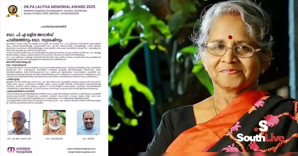 മലബാര് മള്ട്ടി സ്പെഷ്യാലിറ്റി ഹോസ്പിറ്റല് സ്ഥാപകയായ ഡോ. പി.എ. ലളിത അവാര്ഡ് ഡോ. സുരേഷിനും പാലിയത്തിനും. ഡോ. പി.എ ലളിതയുടെ ഓര്മയ്ക്കായി ഏര്പ്പെടുത്തിയ മികച്ച സാന്ത്വനപരിചരണത്തിനുള്ള പുരസ്കാരത്തിനാണ് ഡോ. എം.ആര് രാജഗോപാലിന്റെ സാരഥ്യത്തിലുള്ള പാലിയം ഇന്ത്യയും ലോകാരോഗ്യ സംഘടനയുടെ നിയന്ത്രണത്തിലുള്ള സാന്ത്വനചികിത്സാ പരിപോഷണ കേന്ദ്രത്തിന്റെ ഡയറക്ടര് ഡോ സുരേഷ്കുമാറും അര്ഹരായത്. അരലക്ഷം രൂപ വീതമാണ് അവാര്ഡ് തുക.