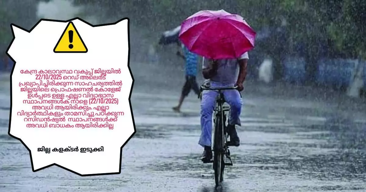 കേന്ദ്ര കാലാവസ്ഥ വകുപ്പ് ജില്ലയിൽ 22/10/2025 റെഡ് അലെർട് പ്രഖ്യാപിച്ചിരിക്കുന്ന സാഹചര്യത്തിൽ ജില്ലയിലെ പ്രൊഫഷണൽ കോളേജ് ഉൾപ്പടെ ഉള്ള എല്ലാ വിദ്യാഭ്യാസ സ്ഥാപനങ്ങൾക് നാളെ (22/10/2025) അവധി ആയിരിക്കും. എല്ലാ വിദ്യാർത്ഥികളും താമസിച്ചു പഠിക്കുന്ന റസിഡൻഷ്യൽ സ്ഥാപനങ്ങൾക്ക് അവധി ബാധകം ആയിരിക്കില്ല.