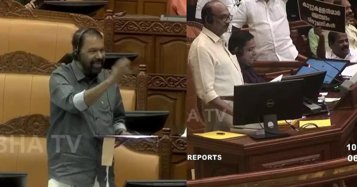 സീക്കറുടെ മുഖംമറച്ചുകൊണ്ടുള്ള പ്രതിപക്ഷ പ്രതിഷേധത്തിൽ മന്ത്രി അസ്വസ്ഥത പ്രകടിപ്പിച്ചു. ‘അങ്ങയെ കണ്ടൂകൂട, അങ്ങ് ഒന്ന് എണീറ്റ് നിൽക്ക്. അങ്ങയുടെ മുഖം ഒന്ന് കാണട്ടെ’ എന്ന് വി.ശിവൻകുട്ടി പറയുന്നുണ്ടായിരുന്നു. പ്രതിപക്ഷത്തിന് ഒരു മര്യാദയും ഇല്ലെന്ന് പറഞ്ഞ മന്ത്രി എങ്ങനെയാണ് സമരം ചെയ്യേണ്ടതെന്ന് പറഞ്ഞ് തരാമെന്നും പറയുകയുണ്ടായി.