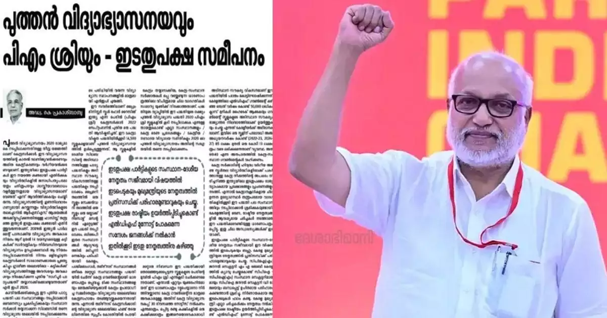 കേന്ദ്ര സർക്കാർ വിദ്യാഭ്യാസ പദ്ധതിയായ പിഎം ശ്രീയിൽ ഒപ്പ് വെച്ചതിന് പിന്നാലെ ഉണ്ടായ വഹിന്നത് തീർത്തതിന് സിപിഐഎം ജനറൽ സെക്രട്ടറി എം എ ബേബിക്ക് അഭിനന്ദനം. ജനയുഗം ലേഖനത്തിൽ സിപിഐ ദേശീയ സെക്രട്ടറിയേറ്റ് അംഗം കെ പ്രകാശ് ബാബു എഴുതിയ ലേഖനത്തിലാണ് അഭിനന്ദനം. ലേഖനത്തിൽ മുഖ്യമന്ത്രിയെയും പരാമർശിക്കുന്നുണ്ട്.