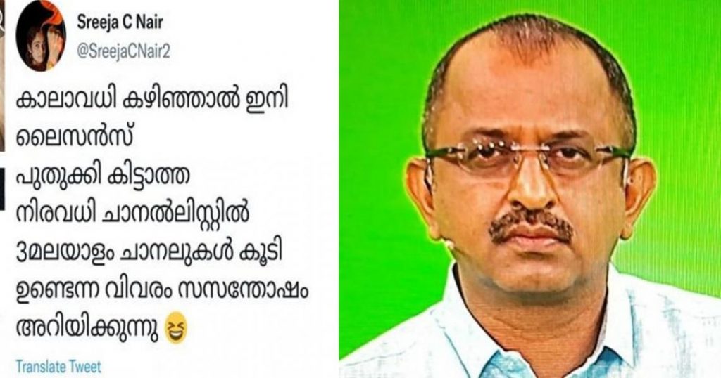 ‘കാലാവധി കഴിഞ്ഞ് ലൈസന്സ് പുതുക്കി കിട്ടാത്ത നിരവധി ചാനലുകളുടെ ലിസ്റ്റില് മൂന്ന് മലയാളം ചാനലുകള് കൂടിയുണ്ടെന്ന വിവരം സസന്തോഷം അറിയിക്കുന്നു,’ എന്നാണ് ശ്രീജ നായരുടെ ട്വീറ്റിന്റെ പൂര്ണ രൂപം.