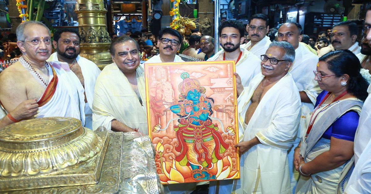 ശ്രീകൃഷ്ണ കോളജ് മൈതാനത്ത് ഹെലികോപ്റ്ററില് വന്നിറങ്ങിയ മുകേഷ് അംബാനി റോഡ് മാര്ഗം തെക്കേ നടയില് ശ്രീവത്സം അതിഥി മന്ദിരത്തിനു മുന്നിലെത്തുകയായിരുന്നു. ദേവസ്വം ചെയര്മാന് ഡോ.വി.കെ. വിജയന്, ഭരണ സമിതി അംഗം സി.മനോജ്, അഡ്മിനിസ്ട്രേറ്റര് ഒ.ബി. അരുണ്കുമാര് എന്നിവര് ചേര്ന്ന് മുകേഷ് അംബാനിയെ സ്വീകരിച്ചു. ദേവസ്വം ചെയര്മാന് അംബാനിയെ പൊന്നാടയണിയിച്ചാണ് സ്വീകരിച്ചത്. തുടര്ന്ന് തെക്കേ നടപ്പന്തലിലൂടെ കിഴക്കേ ഗോപുര കവാടത്തിലെത്തി.