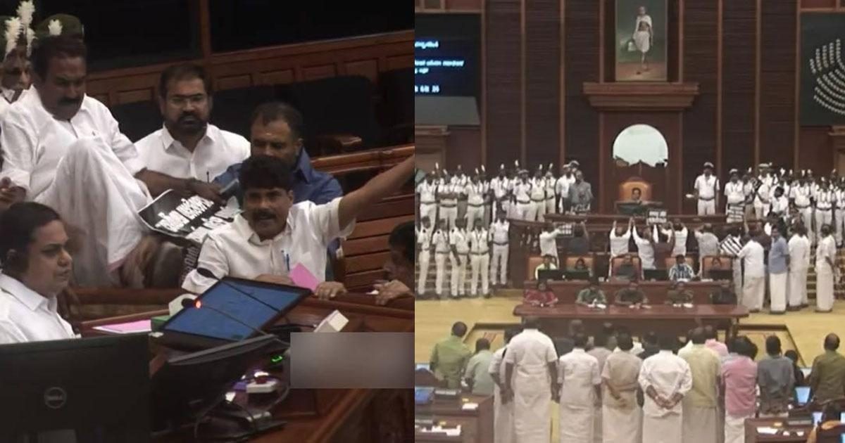 സ്വർണക്കൊള്ള വിഷയം ഉന്നയിച്ചതോടെ സഭ പ്രക്ഷുബ്ദമായി. സ്വർണക്കൊള്ളയിൽ സർക്കാരിനെ വിമർശിച്ച് പ്രതിപക്ഷം ബാനർ ഉയർത്തി. ഡയസിനടുത്തെത്തി തൻറെ മുഖം മറയ്ക്കും വിധം ബാനർ ഉയർത്തിയ പ്രതിപക്ഷത്തോട് ബാനർ താഴ്ത്തണമെന്ന് സ്പീക്കർ ആവശ്യപ്പെട്ടു. ബാനർ താഴ്ത്തിയില്ലെങ്കിൽ പിടിച്ചു മാറ്റുമെന്നും സ്പീക്കർ പറഞ്ഞു. ഇതിനിടെയാണ് ഡയസിലേക്ക് കയറാനുള്ള പ്രതിപക്ഷ ശ്രമം നടന്നത്.