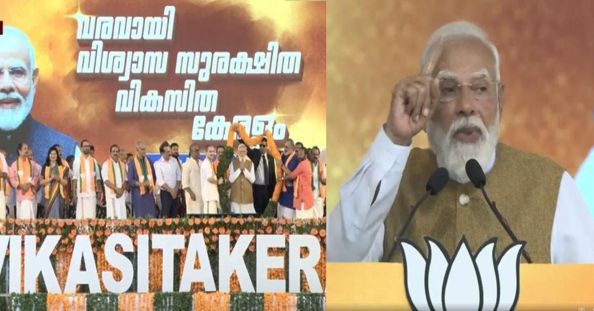 കേരളത്തിന്റെ ഭാവി മാറ്റുന്ന തിരഞ്ഞെടുപ്പായിരിക്കും ഇത്തവണത്തേതെന്ന് പറഞ്ഞ മോദി ഇതുവരെ രണ്ട് പക്ഷത്തേ മാത്രമാണ് കേരളം കണ്ടിരുന്നതെന്നും അത് ഇടതും വലതുമാണെന്നും ഇനി മൂന്നാമത്തെ ഒരു പക്ഷം കൂടിയുണ്ടാകുമെന്നും പറഞ്ഞു. അത് വികസനത്തിന്റെ എന്ഡിഎ എന്ന പക്ഷമാണെന്നാണും മോദി പറഞ്ഞു. എല്ഡിഎഫിന്റെയും യുഡിഎഫിന്റെയും ചിഹ്നം രണ്ടാണെങ്കിലും അജണ്ട ഒന്ന് തന്നെയാണെന്നും മോദി പറഞ്ഞു. ത്രിപുരയില് മുപ്പത് വര്ഷം സിപിഎം ഭരിച്ചു. അതിന് ശേഷം ജനങ്ങള് മാറി ചിന്തിച്ചു. ഇന്ന് അവിടെ എല്ഡിഎഫിനെ പേരിന് പോലും കാണുന്നില്ലെന്ന് മോദി ചൂണ്ടിക്കാട്ടി. ബംഗാളില് 35-40 വര്ഷം ഇടതുപക്ഷം ഭരിച്ചു. ഇന്നവിടെ മത്സരിക്കാന് പോലും സിപിഎമ്മിന് ആളില്ലെന്നും മോദി പരിഹസിച്ചു. കേരളം രക്ഷപ്പെടണമെങ്കില് ഇടത്-വലത് കൂട്ടുകക്ഷി ഭരണം അവസാനിപ്പിക്കണമെന്നും അവര് അഡ്ജസ്റ്റ്മെന്റ് രാഷ്ട്രീയമാണ് നടത്തുന്നതെന്നും പ്രധാമന്ത്രി പറഞ്ഞു. അയ്യങ്കാളിയേയും മന്നത്ത് പത്മനാഭനയേയും ശ്രീനാരായ ഗുരുവിനെയും അനുസ്മരിച്ചാണ് പ്രധാനമന്ത്രി പ്രസംഗം ആരംഭിച്ചത്.