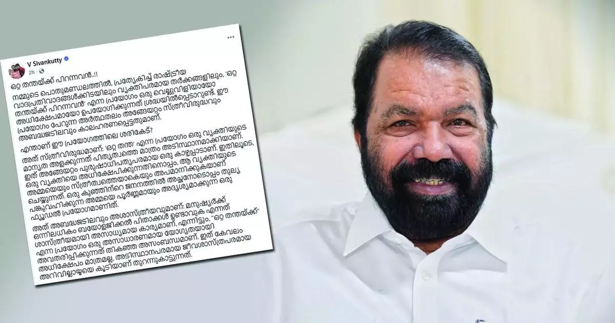 'ഒറ്റ തന്തയ്ക്ക് പിറന്നവൻ' പ്രയോഗം സ്ത്രീവിരുദ്ധം, പുരുഷാധിപത്യപരമായ കാഴ്ചപ്പാട്; ഒരു വ്യക്തിയുടെ അമ്മയെയും സ്ത്രീത്വത്തെയാകെയും അപമാനിക്കുന്നു; ഫേസ്ബുക്ക് പോസ്റ്റുമായി വി ശിവൻകുട്ടി