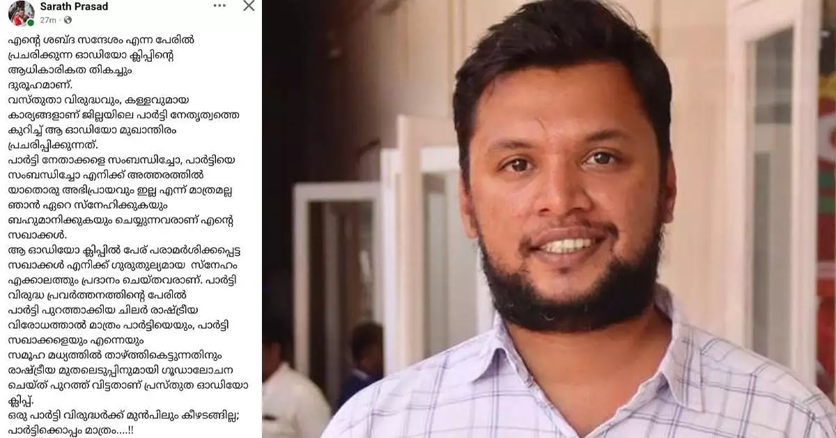 പാർട്ടി നേതാക്കളെ സംബന്ധിച്ച് തനിക്ക് അങ്ങനെയൊരു അഭിപ്രായം ഇല്ലെന്നും ശരത് പ്രസാദ് പോസ്റ്റിൽ പറയുന്നു. പാർട്ടി വിരുദ്ധ പ്രവർത്തനത്തിന്റെ പേരിൽ പാർട്ടിയിൽ നിന്നും പുറത്തു പോയവർ ഗൂഢാലോചന നടത്തുന്നു. വസ്തുതാ വിരുദ്ധവും കള്ളവുമായ കാര്യങ്ങളാണ് ജില്ലയിലെ പാര്ട്ടി നേതൃത്വത്തെക്കുറിച്ച് ഓഡിയോ മുഖാന്തിരം പ്രചരിപ്പിക്കുന്നതെന്നും ശരത് പ്രസാദ് ഫേസ്ബുക്ക് കുറിപ്പില് പറയുന്നു.