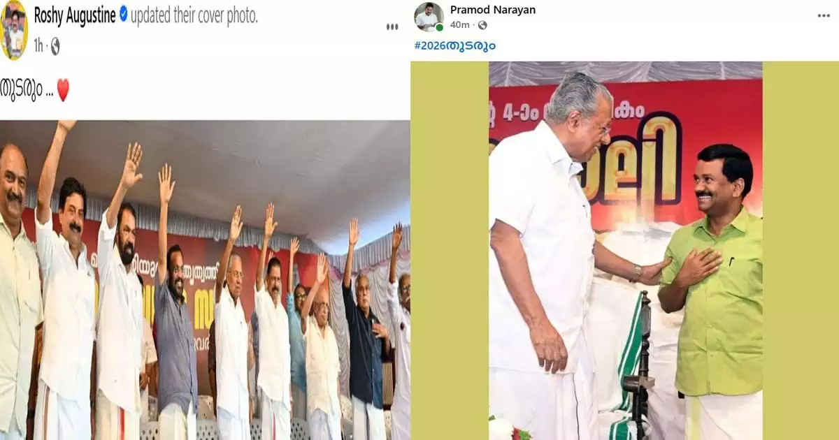 മുഖ്യമന്ത്രിയും എം വി ഗോവിന്ദനും ബിനോയ് വിശ്വവുമടക്കമുള്ള നേതാക്കള്ക്കൊപ്പമുള്ള ചിത്രം പങ്കുവെച്ച് തുടരും എന്ന ക്യാപ്ഷനിലാണ് മന്ത്രി റോഷി അഗസ്റ്റിൻ ഫേസ്ബുക്കില് പോസ്റ്റ് പങ്കുവെച്ചിട്ടുള്ളത്. ഫേസ്ബുക്ക് പോസ്റ്റുമായി പ്രമേദ് നാരായണന് എംഎല്എയും രംഗത്തെത്തി. തുടരും എന്നകുറിപ്പോടെ മുഖ്യമന്ത്രിക്കൊപ്പമുള്ള ചിത്രമാണ് പോസ്റ്റ് ചെയ്തത്. മന്ത്രി റോഷി അഗസ്റ്റിന് പോസ്റ്റിട്ടതിന് പിന്നാലെയാണ് എംഎല്എയുടെയും പോസ്റ്റ്.