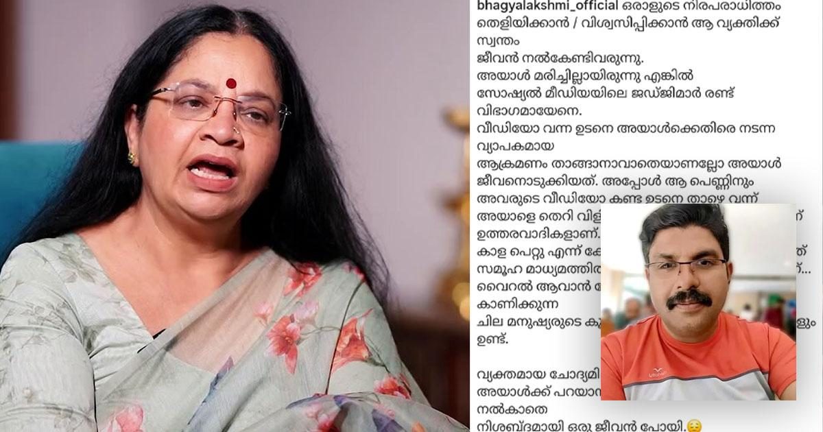 വിഡിയോ പ്രചരിപ്പിച്ച സ്ത്രീയും സമൂഹ മാധ്യമങ്ങളിലൂടെ തെറി വിളിച്ചവരും അയാളുടെ മരണത്തിന് ഉത്തരവാദികളാണെന്ന് ഭാഗ്യലക്ഷ്മി പങ്കുവെച്ച കുറിപ്പിൽ പറയുന്നു. വ്യക്തമായ ചോദ്യമില്ലാതെ അയാൾക്ക് പറയാനുള്ളത് കേൾക്കാൻ അവസരം നൽകാതെ നിശബ്ദമായി ഒരു ജീവൻ നഷ്ടമായി. കുറ്റം ചെയ്തവർ ശിക്ഷിക്കപ്പെടണമെന്നും നിരപരാധിക്ക് നീതി കിട്ടണമെന്നും ഭാഗ്യലക്ഷ്മി പറഞ്ഞു.