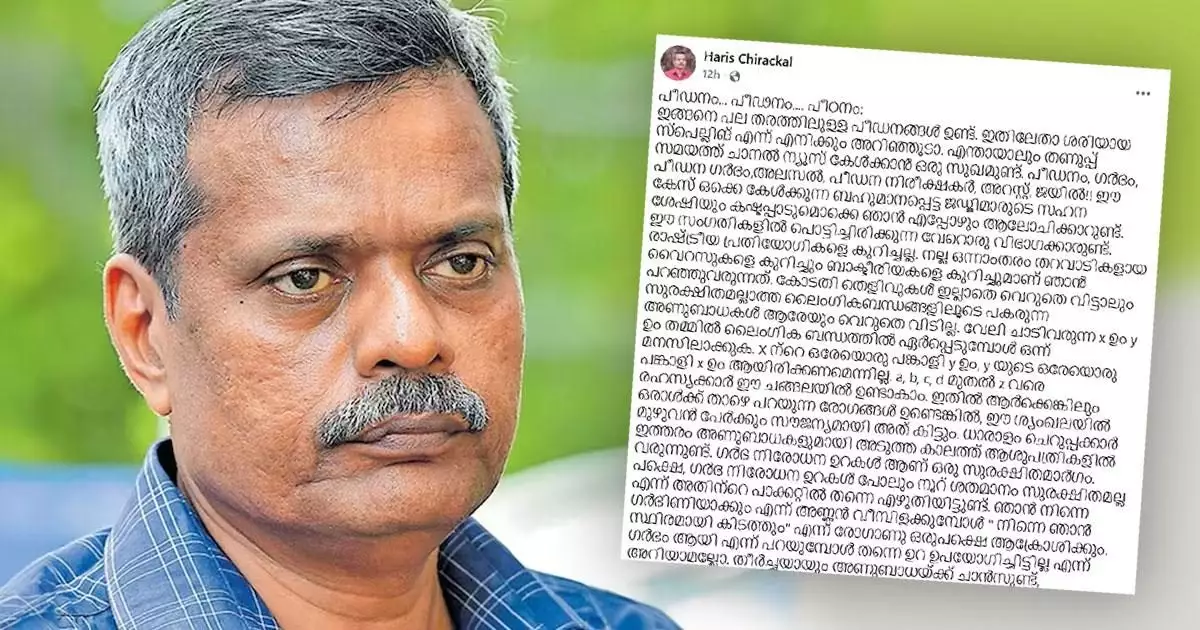 ‘പീഡനം… പീഢനം…. പീഠനം’ ഇങ്ങനെ പല തരത്തിലുള്ള പീഡനങ്ങൾ ഉണ്ടെന്ന് പറഞ്ഞാണ് ഹാരിസ് കുറിപ്പ് തുടങ്ങുന്നത്. ഇതിലേതാ ശരിയായ സ്പെല്ലിങ് എന്ന് എനിക്കും അറിഞ്ഞൂടാ. എന്തായാലും തണുപ്പ് സമയത്ത് ചാനൽ ന്യൂസ് കേൾക്കാൻ ഒരു സുഖമുണ്ട്. പീഡനം, ഗർഭം, പീഡന ഗർഭം,അലസൽ, പീഡന നിരീക്ഷകർ, അറസ്റ്റ്, ജയിൽ!! ഈ കേസ് ഒക്കെ കേൾക്കുന്ന ബഹുമാനപ്പെട്ട ജഡ്ജിമാരുടെ സഹന ശേഷിയും കഷ്ടപ്പാടുമൊക്കെ ഞാൻ എപ്പോഴും ആലോചിക്കാറുണ്ട്.