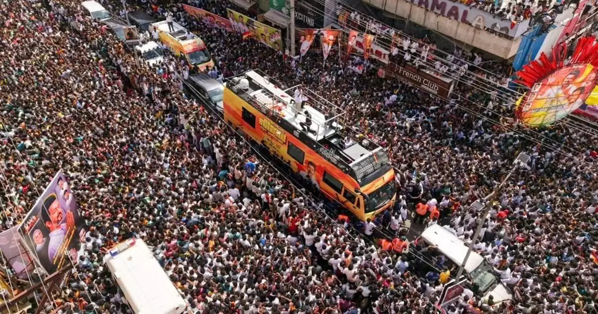 25000 മുതൽ 30000ത്തിനടുത്ത് ആളുകൾ എത്തിയെന്നാണ് കണക്കുകൂട്ടുന്നത്. നീണ്ടുകിടക്കുന്ന റോഡിലാണ് റാലി നടന്നത്. ആളുകൾ വിജയിയുടെ വാഹനം പിന്തുടരുന്നത് തിക്കും തിരക്കും കൂടാൻ കാരണമായി. ആളുകൾ സ്ഥലത്ത് നിന്ന് പോകാതെ മുന്നോട്ട് നീങ്ങിയതും പ്രശ്നമുണ്ടാക്കി.