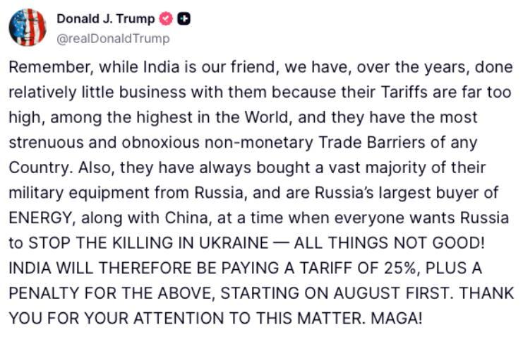 “ഇന്ത്യ നമ്മുടെ സുഹൃത്താണെങ്കിലും, വർഷങ്ങളായി നമ്മൾ അവരുമായി താരതമ്യേന വളരെ കുറച്ച് മാത്രമേ ഇടപാടുകൾ നടത്തിയിട്ടുള്ളൂ, കാരണം അവരുടെ താരിഫ് വളരെ ഉയർന്നതാണ്. അതായത്, ലോകത്തിലെ ഏറ്റവും ഉയർന്ന തീരുവയിൽ ഒന്ന്. കൂടാതെ മറ്റ് ഏതൊരു രാജ്യത്തേക്കാളും കൂടുതൽ വ്യാപാര തടസ്സങ്ങൾ അവർക്കുണ്ട്”, എന്ന് ട്രംപ് കുറിച്ചു . അതിനാൽ ഓഗസ്റ്റ് 1 മുതൽ ഇന്ത്യ 25% താരിഫും റഷ്യൻ ആയുധങ്ങളും എണ്ണയും ഉപയോഗിച്ചതിന് പിഴയും നൽകേണ്ടി വരുമെന്ന് ട്രംപ് പോസ്റ്റിൽ പറഞ്ഞു. റഷ്യയുമായുള്ള ഇന്ത്യയുടെ സൈനിക, ഊർജ്ജ പങ്കാളിത്തം തുടരുന്നതിനെയും ട്രംപ് വിമർശിച്ചു. സൈനിക ഉപകരണങ്ങളിൽ ഭൂരിഭാഗവും ഇന്ത്യ വാങ്ങിയിരുന്നത് റഷ്യയിൽ നിന്നാണ് എന്ന് യു.എസ് പ്രസിഡന്റ് പറഞ്ഞു. യുക്രൈയ്നിലെ ആക്രമണം റഷ്യ അവസാനിപ്പിക്കണമെന്ന് എല്ലാവരും ആഗ്രഹിക്കുന്ന ഒരു സമയത്ത്, ചൈനയ്ക്കൊപ്പം റഷ്യയുടെ ഏറ്റവും വലിയ ഊർജ്ജ വിപണിയായി ഇന്ത്യ മാറിയത് നിസ്സാര കാര്യമല്ലെന്നും ട്രംപ് കൂട്ടിച്ചേർത്തു.