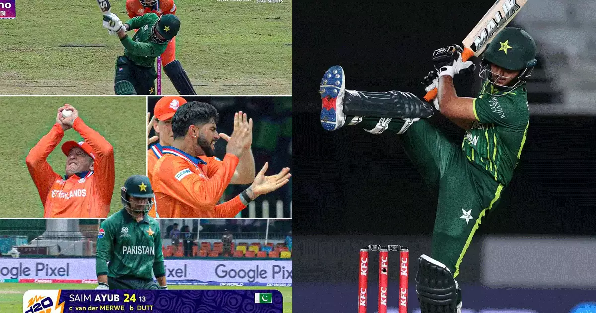 ബാറ്റിംഗിൽ പാകിസ്ഥാൻ താരം സായീം അയൂബിനെതിരെ വൻ ട്രോൾ മഴയാണ് ലഭിക്കുന്നത്. താരം പുറത്തായത് സാധാരണ പുറത്താകലിലൂടെയല്ല. ആര്യൻ ദത്തിനെതിരെ അടിച്ച പന്ത് സിക്സ് പോകും എന്ന വിശ്വാസത്തിൽ നോ ലുക്ക് ഷോട്ട് കളിച്ച പോലെ നിന്ന അയൂബിനു തെറ്റ് പറ്റി. അതൊരു നോ ലുക്ക് ഔട്ട് ആയി മാറിയിരുന്നു. നെതെർലാൻഡ്‌സ് താരം റോളോഫ് വാൻ ഡെർ മെർവെയ്ക്ക് ക്യാച്ച് നൽകിയാണ് താരം മടങ്ങിയത്.