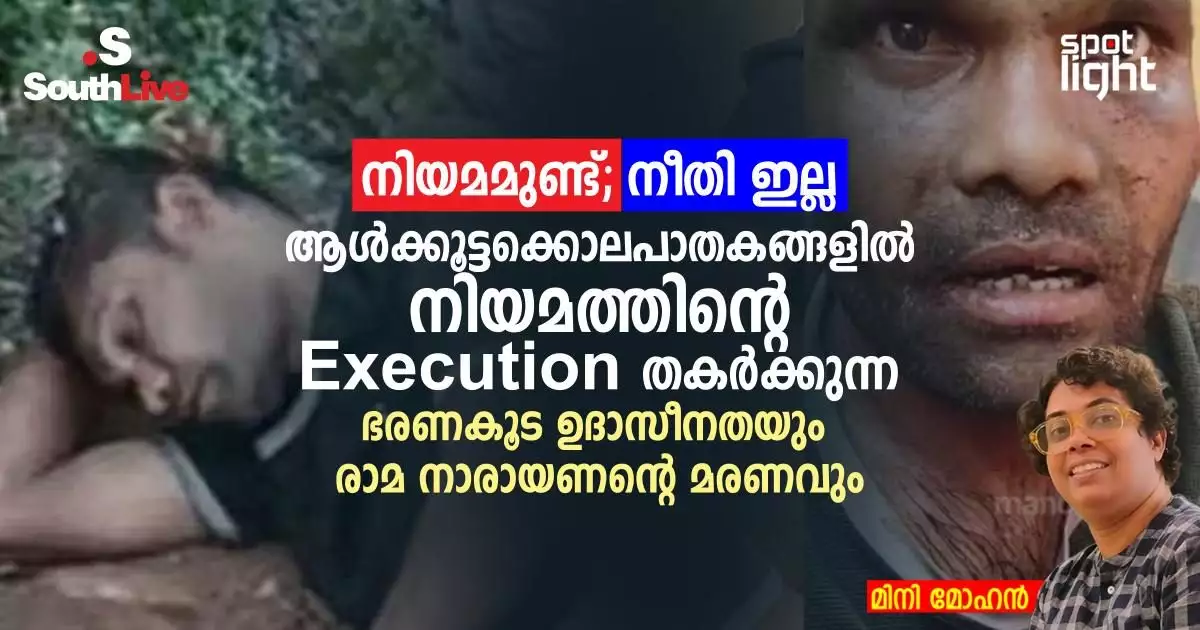 രാമ നാരായണന്റെ മരണം ഒരു വ്യക്തിയുടെ ജീവൻ നഷ്ടപ്പെട്ട സംഭവം മാത്രമായി ചുരുക്കപ്പെടുന്ന നിമിഷം മുതൽ തന്നെ ഒരു വലിയ ഭരണഘടനാ പരാജയം ആരംഭിച്ചിട്ടുണ്ട്. കാരണം ഇവിടെ പരാജയപ്പെട്ടിരിക്കുന്നത് മനുഷ്യസഹാനുഭൂതിയോ ഭരണകൂടത്തിന്റെ മനുഷ്യത്വമോ മാത്രമല്ല; നിയമത്തിന്റെ നടപ്പാക്കൽ, അതായത് execution of law എന്നതിന്റെ പൂർണമായ തകർച്ചയാണ്. ഇന്ത്യയിൽ ആൾക്കൂട്ടക്കൊലപാതകങ്ങളെ എങ്ങനെ കൈകാര്യം ചെയ്യണം എന്നതിനെക്കുറിച്ച് നിയമപരമായ ആശയക്കുഴപ്പം ഒന്നുമില്ല. നിയമവ്യവസ്ഥ മൗനത്തിലുമല്ല. എന്നിട്ടും ഓരോ ലിഞ്ചിങ് മരണത്തിനും പിന്നാലെ സംഭവിക്കുന്നത് ഒരേ കാര്യമാണ്: നിയമം പുസ്തകത്തിൽ ഉറങ്ങുന്നു, ഭരണകൂടം മൗനം പാലിക്കുന്നു, നീതി മരിക്കുന്നു.